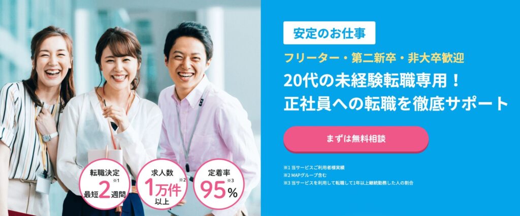 | 強み | ・「キャリアプランの言語化」が得意なコンサルタント多数在籍 ・企業担当者の選考対策が有益で面接通過率が上がる! ・「求人企業は厳選した成長企業」だから、20代からのキャリアの挽回ができる! |