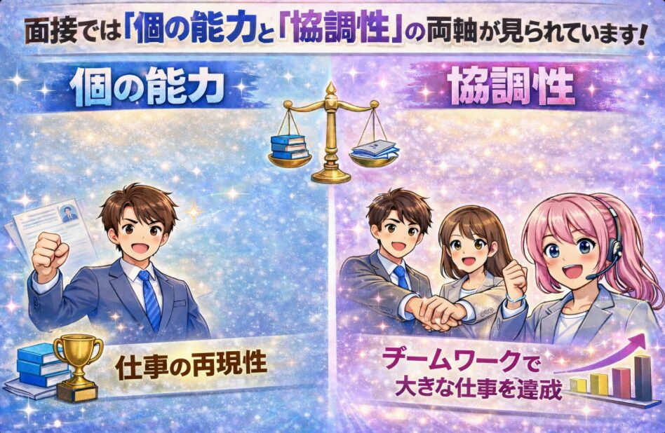 面接では「個の能力」と「協調性」の両軸が見られています。